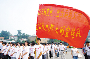 ?學生志愿者做微塵公交售報活動啟動,志愿者接旗。 記者 王建亮 實習生 孫亮 攝