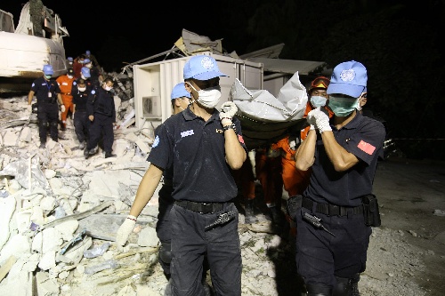 記者在太子港聯(lián)合國駐海地穩(wěn)定特派團(聯(lián)海團)總部大樓營救現(xiàn)場看到,每具中方人員遺體被挖出時,中國駐海地維和警察防暴隊員和中國國際救援隊員都面向遺體列隊默哀,并致以三鞠躬。記者看到,面對曾朝夕相處的隊友,許多維和警察防暴隊員都紅了眼圈。有位救援隊員一直舉著一塊“戰(zhàn)友!我們接您回家!”的牌子。