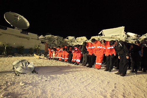 中國國際救援隊隊員以及公安部、外交部的工作人員為挖掘出的一名中方失蹤人員默哀。新華社