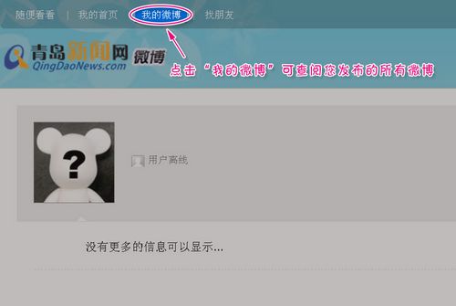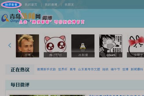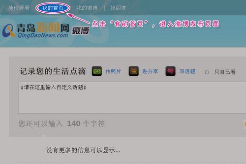 新聞網(wǎng)微博新手指南: 1、在地址欄輸入t.qingdaonews.com,在網(wǎng)頁(yè)右上方注冊(cè)登陸; 2 、登陸后,請(qǐng)?jiān)诰W(wǎng)頁(yè)最上方點(diǎn)擊“我的首頁(yè)”,進(jìn)入微博發(fā)布頁(yè)面;點(diǎn)擊“我的微博”可查閱您發(fā)布的所有微博;點(diǎn)擊“隨便看看”可回到微博首頁(yè)。