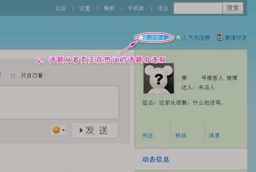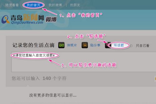 ![]() 3、在“我的首頁(yè)”中,在發(fā)送框上方點(diǎn)擊“寫話題”,可以寫您感興趣的話題(話題從首頁(yè)正在熱議的話題中選?。?。