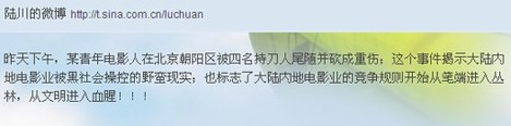 陸川在微博上爆料導演鄢頗被砍成重傷