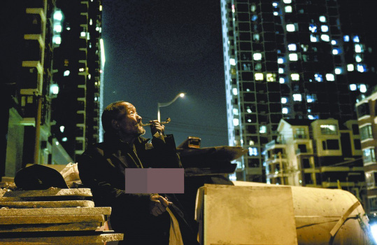 22日晚,想家的曹大爺倚在"家"門口的建筑材料上,身后是高層小區(qū)的點(diǎn)點(diǎn)燈火