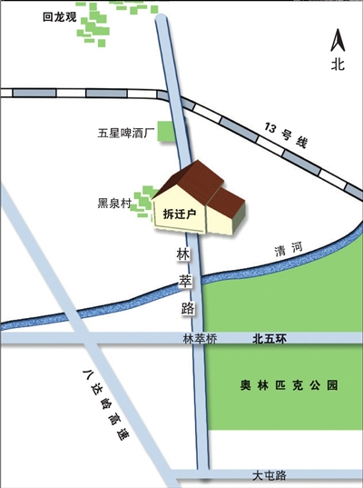 圍觀者口中的老徐叫徐景明,黑泉村32號(hào)的主人。此前黑泉村32號(hào)在網(wǎng)上有個(gè)稱號(hào):北京“最牛釘子戶”,這緣于林萃路工程。5年前,北京市規(guī)劃委發(fā)布消息,“連接五環(huán)路與回龍觀北街的林萃路將開工,通車后,八達(dá)嶺高速路擁堵的現(xiàn)象將有所緩解?!钡州吐凡⑽丛?008年如期完工,其中在黑泉路一段,始終無法完成規(guī)劃中的貫通,即使后期工程施工方臨時(shí)做出一些更改,但行駛至此的雙方向車輛,只能沿著一條車道,從房子旁邊繞行,堵車是經(jīng)常的事情。2009年,海淀區(qū)政府回復(fù)居民稱,路中一拆遷戶遲遲不肯搬遷,索要580萬元補(bǔ)償,遠(yuǎn)超180萬元的補(bǔ)償標(biāo)準(zhǔn)。