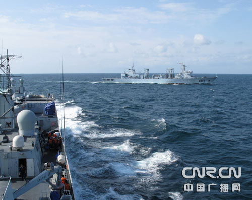 2008年春節(jié)前夕,“微山湖”號(hào)綜合補(bǔ)給艦為“海口”號(hào)導(dǎo)彈驅(qū)逐艦進(jìn)行綜合補(bǔ)給,完成補(bǔ)給的“微山湖”號(hào)綜合補(bǔ)給艦與“??凇碧?hào)導(dǎo)彈驅(qū)逐艦分開。中廣軍事記者孫利攝于??谂?/p>
