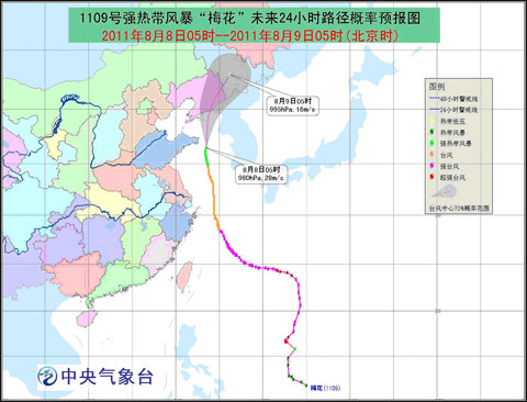 預計,“梅花”將以每小時25-30公里的速度向偏北方向移動,強度緩慢減弱,并逐漸向遼寧莊河到朝鮮西部一帶沿??拷⒂?日傍晚前后在這一帶沿海登陸。