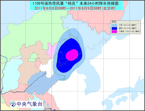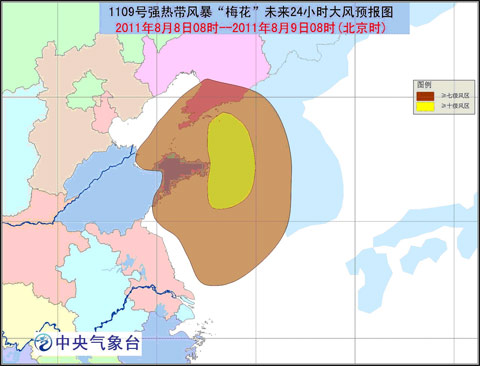 受“梅花”影響,8月8日08時至9日08時,渤海東部、渤海海峽、黃海大部以及遼東半島及其沿海、山東半島及其沿海將有7-8級大風,“梅花”中心經(jīng)過的附近海面的風力有9-10級;山東半島東部、遼寧大部、吉林南部等地有大到暴雨,其中,遼寧中東部的部分地區(qū)有大暴雨,局地特大暴雨。