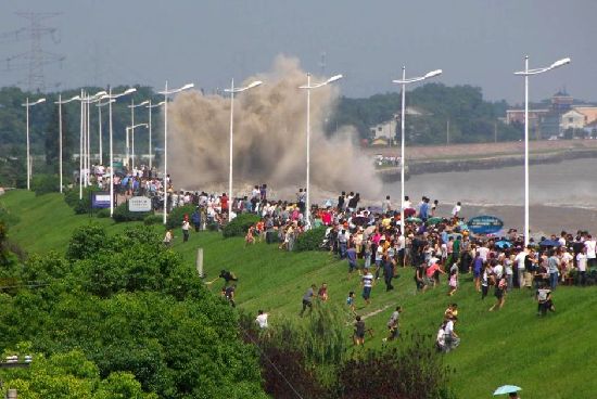 2011年8月31日,農(nóng)歷八月初三,下午15:15左右,在錢塘江杭州段最上游的傳統(tǒng)觀潮點——九溪水廠觀潮點附近,預(yù)測中的大潮訊如期而至,洶涌的潮水翻過江堤護欄激起7、8米的浪頭,將數(shù)十名觀潮者沖倒在地,多人受傷,十余輛停在堤岸上的汽車被沖移。據(jù)悉,當日潮水受臺風“南瑪都”外圍影響,潮借風勢,創(chuàng)造了近十年來的最高值。