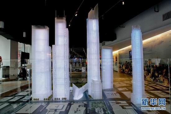 這是9月7日在美國紐約世貿(mào)中心7號樓內(nèi)拍攝的世貿(mào)中心重建效果模型。當日,世貿(mào)中心重建工程新聞發(fā)布會在世貿(mào)中心7號樓內(nèi)舉辦。位于世貿(mào)中心的9/11紀念碑將于本周日“9·11”恐怖襲擊十周年紀念時正式開放(新華社發(fā) 樊夏 攝)