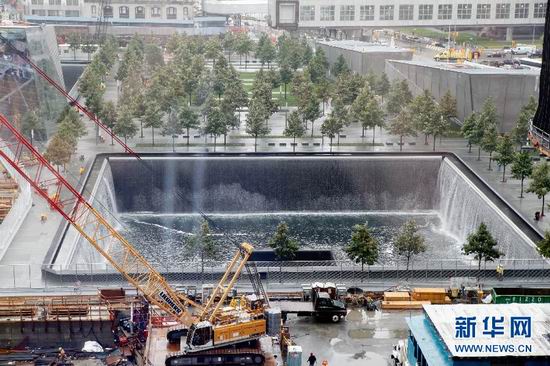 這是9月7日在美國紐約拍攝的位于世貿(mào)中心的9/11紀念碑。當日,世貿(mào)中心重建工程新聞發(fā)布會在世貿(mào)中心7號樓內(nèi)舉辦。位于世貿(mào)中心的9/11紀念碑將于本周日“9·11”恐怖襲擊十周年紀念時正式開放(新華社發(fā) 樊夏 攝)