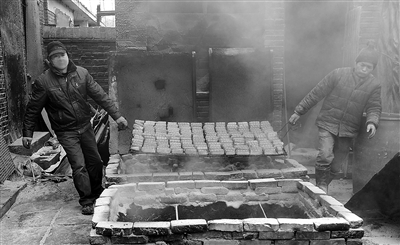 前日下午,熏干作坊里,倆工人從熏池里抬出已經(jīng)熏好的熏干。 黑作坊查獲1200斤香干 兩家黑作坊位于小辛莊村,由昌平區(qū)東小口鎮(zhèn)管轄,但一墻之隔就是平西府村,由北七家鎮(zhèn)管轄,“該區(qū)域處于城鄉(xiāng)接合部,又處于兩鎮(zhèn)連接處,流動人口很多,黑作坊也很多。” 前日下午,十余名執(zhí)法人員來到生產(chǎn)熏干的大院,四五個鐵箅子前,兩名男子正在烤制熏干。隔壁院的香干加工點,場景更為壯觀,80余箱已制作好的黃色香干露天擺放,周圍下水溝里污水流淌。每箱香干15斤左右,已生產(chǎn)出的香干達(dá)1200斤左右??澙@的霧氣里,七八名工人正在制作香干,加工間一股惡臭。 經(jīng)聯(lián)合執(zhí)法隊認(rèn)定,這兩家生產(chǎn)熏干和香干的加工點沒有相關(guān)手續(xù),屬于黑作坊。 |