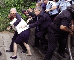 1月26日是澳大利亞國(guó)慶日。當(dāng)天,澳大利亞女總理吉拉德在首都堪培拉參加國(guó)慶慶典活動(dòng)時(shí),遭到大約200名土著居民的包圍抗議。在保鏢和防暴警察組成的人墻護(hù)送下,吉拉德安全脫逃,但在慌亂中跑掉一只鞋。圖為保鏢護(hù)送吉拉德撤離。