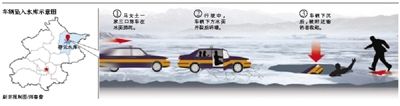 前日下午4時許,韓先生在密云水庫邊上放牛。他看見一輛出租車駛入水庫冰面,“下來好像一家三口,在冰面上拍照”。