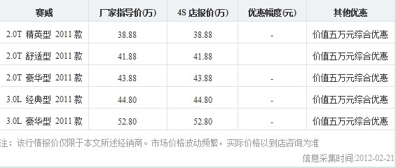 ????青島新聞網(wǎng)汽車訊 編輯近日從青島鴻發(fā)凱迪4S店了解到,店內(nèi)正舉行賽威SLS免費(fèi)升級月活動(dòng),即日起至3月15日,到店購買2011款賽威SLS均可享受價(jià)值五萬元綜合優(yōu)惠:包括兩年全額保險(xiǎn),前座椅電加熱、氙氣前霧燈、座艙氛圍燈、高性能尾翼、倒車影像輔助系統(tǒng)、原廠英文尾部標(biāo)識六項(xiàng)免費(fèi)升級。目前店內(nèi)2.0T、3.0L均有現(xiàn)車,顏色以黑色、金色為主,感興趣的朋友可到店賞車試駕。詳情見下表: ![]() ??? 六件套介紹: