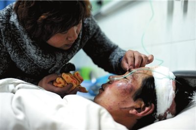 在趙縣人民醫(yī)院外科病房外的走廊上,一名約50歲的中年男子正在臨時病床上接受治療,他的左額頭和左手臂有外傷,剛剛包扎好的紗布上還滲著血跡。據了解,傷者姓楊。