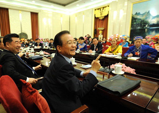 3月9日,中共中央政治局常委、國務(wù)院總理溫家寶參加十一屆全國人大五次會議廣西代表團(tuán)的審議。新華社記者 劉建生 攝 在廣西代表團(tuán),溫家寶同代表們一起審議。代表們圍繞推進(jìn)北部灣經(jīng)濟(jì)區(qū)開放開發(fā)、加強(qiáng)農(nóng)村基礎(chǔ)設(shè)施建設(shè)、打好新一輪扶貧開發(fā)攻堅戰(zhàn)、保障和改善民生等積極發(fā)言。溫家寶聽得十分專注,并對代表的發(fā)言一一作出回應(yīng)。在認(rèn)真聽取郭聲琨、馬飚、楊盛川等代表發(fā)言后,溫家寶說,在我們這樣一個統(tǒng)一的多民族國家,民族關(guān)系始終是至關(guān)重要的社會關(guān)系,民族和諧始終是社會和諧的重要組成部分。我們講各民族共同團(tuán)結(jié)奮斗、共同繁榮發(fā)展,必須同時抓好團(tuán)結(jié)和發(fā)展兩件大事。廣西這些年發(fā)展得很好,一個重要因素是民族團(tuán)結(jié)提供了好的環(huán)境,民族團(tuán)結(jié)促進(jìn)了發(fā)展,反過來,發(fā)展又加強(qiáng)了民族團(tuán)結(jié)。溫家寶強(qiáng)調(diào),平等、團(tuán)結(jié)、互助、和諧是我國社會主義民族關(guān)系的本質(zhì)特征,平等是基礎(chǔ)。各民族一律平等,不僅包括法律上、政治上的平等,也包括經(jīng)濟(jì)、文化各個方面的平等。只有各民族完全平等,國家才能長期穩(wěn)定和發(fā)展。要在平等的基礎(chǔ)上,不斷推進(jìn)各民族的相互學(xué)習(xí)、相互交流,依法妥善處理涉及民族因素的矛盾和糾紛,努力營造各民族和睦相處、和衷共濟(jì)、和諧發(fā)展的良好氛圍。 |