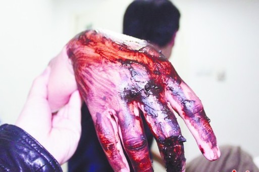 ![]() 加迪被咬傷的右手已腫成了"饅頭",為抑制蛇毒發(fā)作,醫(yī)護(hù)人員為他敷上了黑色的蛇藥。(記者 景毅)