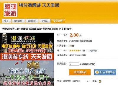 一家銷(xiāo)售低價(jià)旅游券的網(wǎng)店。 網(wǎng)頁(yè)截圖 2元包食宿4天3晚港澳游? 當(dāng)心這張傷不起的旅游券 核心提示 4天3晚港澳游只要花2元?近日,有讀者反映,有購(gòu)物網(wǎng)站在銷(xiāo)售一種旅游券,只要花2元錢(qián),就可享受4天3晚的港澳旅游,包含食宿、門(mén)票。 真有這樣的好事嗎?4月10日,記者進(jìn)行了調(diào)查,并請(qǐng)業(yè)內(nèi)人士揭開(kāi)其中玄機(jī)。 記者調(diào)查:港澳4日旅游券,網(wǎng)上最低1.99元 4月10日,記者登錄某著名購(gòu)物網(wǎng)站看到,許多網(wǎng)店都在以低得令人咋舌的價(jià)格銷(xiāo)售旅游券。以從深圳出發(fā)的港澳4天3晚旅游券為例,報(bào)價(jià)從1.99元到幾十元不等。 記者聯(lián)系了一家“旅游貴賓券旗艦店”,這里正在以1.99元的價(jià)格銷(xiāo)售港澳4天3晚游優(yōu)惠券。一位曾姓工作人員表示,價(jià)格如此便宜,是因?yàn)榈玫搅讼愀凵碳业馁澲?/p> 他解釋?zhuān)?天會(huì)進(jìn)3家店購(gòu)物,包括一家鐘表店、一家珠寶店和DFS環(huán)球免稅店。他表示,這張1.99元的旅游券包含:迪斯尼或海洋公園等景點(diǎn)門(mén)票;從深圳出發(fā)并返回深圳的全程旅游觀(guān)光巴士;餐費(fèi);3晚標(biāo)準(zhǔn)三星級(jí)酒店住宿和旅行社責(zé)任保險(xiǎn)。 真的只要1.99元?面對(duì)記者疑問(wèn),他表示,游客只需要再交導(dǎo)游小費(fèi)和過(guò)關(guān)口岸費(fèi)共220元。 這位工作人員稱(chēng),雖然要去3家店購(gòu)物,但游客可以自行決定是否消費(fèi)?!澳悴毁I(mǎi)東西的話(huà),別的游客可能會(huì)買(mǎi)東西,商家也是可以賺回來(lái)的。” 另一家網(wǎng)店則以2元的價(jià)格銷(xiāo)售港澳4天3晚雙人游優(yōu)惠券,也包含交通、食宿、門(mén)票等費(fèi)用,需要游客自己支付220元的導(dǎo)游小費(fèi)和過(guò)關(guān)口岸費(fèi)。 這家“旅行社”一位劉姓工作人員表示,此旅行券包含的行程中有4家商店的購(gòu)物,均安排在4天行程中的第二天,4家店分別是珠寶店、免稅店、服裝店和鐘表店。 而且,“旅行券要求26至56周歲的人使用,如果在26周歲以下,需要每人多交300元?!边@位工作人員解釋?zhuān)瑢?duì)年齡有限制是因?yàn)?,旅游券是商家贊助的,要考慮游客的消費(fèi)能力。 游客經(jīng)歷:用旅游券游港澳,買(mǎi)回鉆石、手表皆假貨 便宜得離奇的旅游券,如同天上掉餡餅,這餡餅真的好吃嗎?近日,有旅游部門(mén)接到一位游客王女士的投訴。 王女士夫婦想去港澳旅游,聽(tīng)同事介紹淘寶網(wǎng)上熱銷(xiāo)一款旅游券,只需2元錢(qián)就可以買(mǎi)到價(jià)值3980元的港澳4天3晚雙人游優(yōu)惠券。王女士撥打旅游券上的電話(huà)咨詢(xún),對(duì)方說(shuō),“此類(lèi)銷(xiāo)售受香港政府支持”,所以?xún)r(jià)格便宜。除此以外,每人只需要交170元導(dǎo)游小費(fèi)和50元口岸手續(xù)費(fèi)。“因?yàn)槭莾?yōu)惠券,所以不會(huì)簽訂旅游合同?!睂?duì)方表示。 王女士明白天上不可能掉餡餅,也聽(tīng)說(shuō)過(guò)導(dǎo)游強(qiáng)迫游客消費(fèi)的事情。但她想,香港是購(gòu)物天堂,去了肯定是要買(mǎi)東西的,就當(dāng)是把購(gòu)物的錢(qián)當(dāng)作參團(tuán)的費(fèi)用,何樂(lè)而不為呢? 看著網(wǎng)上400多條成交記錄,王女士毫不猶豫下單并報(bào)了名。同行的人都是以旅游券的方式參團(tuán),有的是商場(chǎng)、公司促銷(xiāo)發(fā)放的,有的是辦健身卡送的。 4天行程下來(lái),王女士被導(dǎo)游帶著天天在購(gòu)物店轉(zhuǎn),最終買(mǎi)了2萬(wàn)多元的鉆石、手表?;貋?lái)一鑒定,都是假貨。想要投訴,一查詢(xún)才知道,旅游券上的“××旅行社”和聯(lián)系電話(huà)都是假的。 業(yè)內(nèi)人士表示:超低價(jià)旅游券屬陷阱 4月10日,記者從攜程旅行網(wǎng)上看到,從深圳出發(fā)的港澳3日自由行報(bào)價(jià)在890元以上。而途牛旅游網(wǎng)從深圳出發(fā)的港澳4天3晚游,報(bào)價(jià)為1388元起。 中青旅客戶(hù)服務(wù)中心高級(jí)經(jīng)理隋朝暉表示,網(wǎng)絡(luò)上出現(xiàn)的這種“超低價(jià)格旅游優(yōu)惠券”,顯然屬于變相“零負(fù)團(tuán)費(fèi)”的陷阱。 他說(shuō),眾所周知,任何一個(gè)地接社在接待游客的過(guò)程中,都會(huì)產(chǎn)生相應(yīng)成本,并且他們也需要盈利。任何打著“零團(tuán)費(fèi)”或“負(fù)團(tuán)費(fèi)”幌子招攬游客的旅行社,最后必然會(huì)想盡辦法從游客身上把錢(qián)賺回來(lái),比較常見(jiàn)的就是“強(qiáng)迫購(gòu)物”。如果游客不同意,這些旅行社可能就會(huì)使用辱罵、甩團(tuán)甚至毆打等方式威脅游客,強(qiáng)迫游客就范。 隋朝暉介紹說(shuō),雖然《旅行社條例》明確禁止“零負(fù)團(tuán)費(fèi)”等損害游客利益的行為,但由于各種原因,這一現(xiàn)象目前依然存在。 他提醒游客,選擇旅行社時(shí)一定要牢記,“天上不會(huì)掉餡餅”,要選擇正規(guī)的、有資質(zhì)的企業(yè),不能貪圖小便宜、盲目追求低價(jià)格。尤其值得注意的是,游客一定要與旅行社簽訂正式的合同,要看清楚合同中對(duì)購(gòu)物次數(shù)、購(gòu)物場(chǎng)所名稱(chēng)、每次最長(zhǎng)停留時(shí)間等的規(guī)定,以備發(fā)生糾紛時(shí)有據(jù)可依。 國(guó)家旅游局提醒:參加旅游
