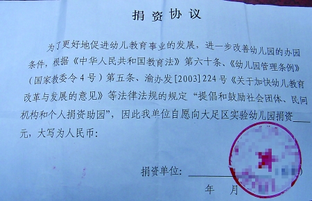 學(xué)校發(fā)的“捐資協(xié)議” 受訪者供圖 家住大足區(qū)的仇勇(化名)有一個(gè)兩歲半的孫女,在大足區(qū)實(shí)驗(yàn)幼兒園上學(xué)。前幾天,仇勇帶著孫女去幼兒園時(shí),收到學(xué)校發(fā)的一份“捐資協(xié)議”。幼兒園老師告訴仇勇,需要仇勇以自己?jiǎn)挝坏拿x向幼兒園繳納500元/年的捐資助學(xué)費(fèi),而且還要在“捐資協(xié)議”蓋上單位的公章。 “這完全是變著花樣讓我們交捐資助學(xué)費(fèi)!”昨日,仇勇氣憤地說,他已經(jīng)向教委反映此情況 家長(zhǎng): 孩子要上學(xué)得先捐資 昨日,仇勇告訴記者,自己的孫女在大足區(qū)實(shí)驗(yàn)幼兒園讀早教班,每周周末上一次課。讀完早教班,孫女明年就準(zhǔn)備進(jìn)入該幼兒園幼兒小班正式上學(xué)了。上周六,仇勇帶著孫女去上課,收到幼兒園發(fā)的一份“捐資協(xié)議”。 “幼兒園老師告訴我,孫女如果要在幼兒園上學(xué),每年就要交500元捐資助學(xué)費(fèi),讀三年,需要一次性將1500元繳完”,仇勇表示,幼兒園讓孩子家長(zhǎng)找其所工作的單位捐資助學(xué),并且還要求讓單位在“捐資協(xié)議”上蓋公章。 “讓單位給員工子女交捐資助學(xué)費(fèi),這可能么?出錢的最后還不是我們自己!我們不愿意交也得交,畢竟孩子要上學(xué)”,仇勇質(zhì)疑說,這完全是幼兒園為了規(guī)避相關(guān)政策而搞的“怪名堂”。 幼兒園: 只是讓家長(zhǎng)找單位捐款 通過網(wǎng)絡(luò),仇勇給記者傳了一張翻拍的“捐資協(xié)議”照片。記者看到,該協(xié)議上寫著“我單位自愿向大足區(qū)實(shí)驗(yàn)幼兒園捐資元”字樣,而在協(xié)議末尾“捐資單位”一欄,仇勇已經(jīng)找單位蓋了一個(gè)公章。 昨日下午,記者聯(lián)系上大足區(qū)實(shí)驗(yàn)幼兒園,一名自稱園長(zhǎng)助理的工作人員解釋稱,幼兒園得到的捐資助學(xué)款將用于幼兒園的基礎(chǔ)建設(shè)。 “捐資助學(xué)費(fèi)的繳納完全是出于家長(zhǎng)自愿,不愿意繳我們也不會(huì)強(qiáng)迫”,該工作人員表示,幼兒園只是讓家長(zhǎng)去找其所在單位捐款,并不是強(qiáng)迫家長(zhǎng)繳納捐資助學(xué)費(fèi)。 隨后,這名工作人員以自己不方便聊、幫記者找園長(zhǎng)為由,匆忙掛斷了電話。 回應(yīng) 大足區(qū)教委:已著手展開調(diào)查 昨日,記者就此事向大足區(qū)教委進(jìn)行了反映。“根據(jù)今年年初國家發(fā)展改革委、教育部、財(cái)政部制定《幼兒園收費(fèi)管理暫行辦法》,無論是公立還是民辦,幼兒園不得以任何名義向幼兒家長(zhǎng)收取與入園掛鉤的捐資助學(xué)費(fèi)等費(fèi)用”,大足區(qū)教委副主任伍天澤告訴記者。 據(jù)悉,《幼兒園收費(fèi)管理暫行辦法》第12條規(guī)定,幼兒園不得以任何名義向幼兒家長(zhǎng)收取與入園掛鉤的贊助費(fèi)、捐資助學(xué)費(fèi)、建校費(fèi)、教育成本補(bǔ)償費(fèi)等費(fèi)用。第13條則規(guī)定,社會(huì)團(tuán)體、個(gè)人自愿對(duì)幼兒園的捐資助學(xué)費(fèi),按照國家《公益事業(yè)捐贈(zèng)法》和有關(guān)社會(huì)捐助教育經(jīng)費(fèi)的財(cái)務(wù)管理辦法執(zhí)行。 大足區(qū)教委稱對(duì)此事已展開調(diào)查,目前尚未確定大足區(qū)實(shí)驗(yàn)幼兒園是否違規(guī)收取捐資助學(xué)費(fèi)。(記者 吳光亮) |