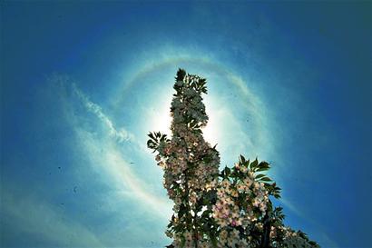 ![]() “看,空中七彩光環(huán)環(huán)抱太陽,地上是一片櫻花花海,真是難得!”昨天上午10時(shí),正在中山公園賞櫻的市民惠女士發(fā)現(xiàn),天空出現(xiàn)日暈奇景,日暈仿佛一道環(huán)抱太陽的彩虹,許多市民駐足觀望,欣賞這一鮮見的氣象奇觀。 據(jù)氣象專家介紹,日暈是一種比較罕見的大氣現(xiàn)象,是因?yàn)榫嚯x地面10公里以上的高空中出現(xiàn)了由冰晶構(gòu)成的卷層云,陽光透過這些云層產(chǎn)生折射后,便分解成紅、綠、橙、紫等多種顏色,形成了“日暈”。 氣象專家介紹說,日暈在一定程度上可以成為風(fēng)雨將臨的一種前兆,在我國農(nóng)諺中,就有“日暈三更雨,月暈午時(shí)風(fēng)”的說法。(記者 于小陽 攝) |
