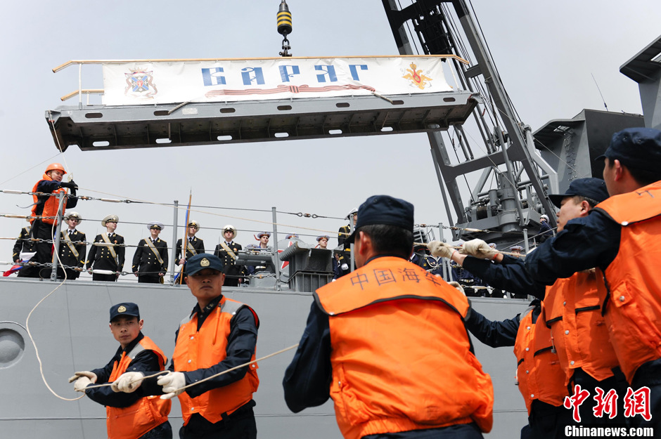 4月27日中午,參加中俄“海上聯(lián)合-2012”海上聯(lián)合軍事演習(xí)的俄羅斯艦艇編隊(duì)離開(kāi)青島港啟程回國(guó)。中國(guó)海軍官兵為俄羅斯艦艇舉行了隆重的歡送儀式。圖為俄“瓦格良”號(hào)導(dǎo)彈巡洋艦收起旋梯準(zhǔn)備離港。中新社發(fā)劉震 攝