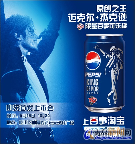 ????今年適逢流行音樂(lè)之王Michael Jackson標(biāo)志性專(zhuān)輯《BAD》發(fā)行25周年,百事公司于美國(guó)東部時(shí)間2012年5月3日宣布與邁克爾杰克遜遺產(chǎn)管理公司正式達(dá)成合作伙伴關(guān)系,將攜手在全球發(fā)起慶?!禕AD》專(zhuān)輯發(fā)行25周年系列活動(dòng),向邁克爾.杰克遜致敬。中國(guó)將是百事全球第一個(gè)發(fā)起“致敬原創(chuàng)之王MJ“系列活動(dòng)的國(guó)家。邁克爾.杰克遜限量版百事可樂(lè)罐山東首發(fā)上市會(huì)將于5月19日上午10:30將于嶗山區(qū)仙霞嶺路樂(lè)天瑪特廣場(chǎng)隆重舉行。