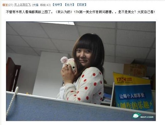 ????提起網(wǎng)絡寫手,大部分人都會覺得十分神秘,提起為網(wǎng)絡寫手服務的作者顧問,知道的人就更加少。然而近日,一個自稱為“大神”級網(wǎng)絡寫手的網(wǎng)友,在國內(nèi)著名的貓撲社區(qū)上發(fā)帖曝光了“17K第一美女作者顧問潘潘日記”,隨日記一起曝光的還有“潘潘”的大量清純照片,該帖迅速吸引了大量網(wǎng)民關注,帖子爆火的同時,部分神秘網(wǎng)絡寫手的形象浮出水面,作者顧問這個以往居于幕后的時尚新職業(yè),也第一次比較清晰地