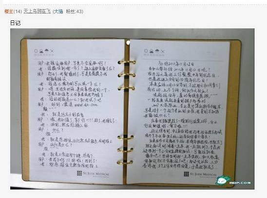 ????接著,該帖作者還特意強調,“對了,第一美女顧問是我說的,這不僅僅指美麗外表,更指美好內(nèi)在。但是潘潘自己并不承認,她很謙虛,說自己在她們美女如云的部門里長得是倒數(shù)第一!具體我說的對還是她在謙虛,相信大家看了照片自有判斷!”隨后,“天上烏鴉在飛”發(fā)布了潘潘日記手寫稿的照片以及文字內(nèi)容,還有潘潘的一些生活照片。文字內(nèi)容記錄了潘潘在為讀者、作者服務過程中所遇到的一些“囧事”和“趣事”,以及工作四年以來的職場酸甜苦辣。