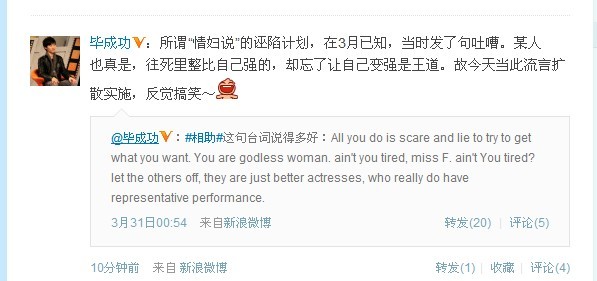 因此,章子怡“情婦說”由范冰冰方面一手炮制也就不足為奇。事后,章子怡通過微博進行回應(yīng),聲稱“造假都造到天上去了?!彪S后,大量圈內(nèi)人士轉(zhuǎn)發(fā)微博進行支援。網(wǎng)友“夜宴_茉莉香 ”說:“轉(zhuǎn)發(fā)最多的就是導(dǎo)演們,很多還是小章沒合作過的導(dǎo)演,包括何平,這也能解釋為什么某人沒片拍。圈子就那么大,難道不曉得導(dǎo)演圈對你的行為都很不齒?即便通過金主拉來投資,導(dǎo)演不照樣辭導(dǎo),不照樣沒導(dǎo)演愿意接手?”