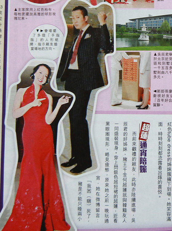 6月2日,臺灣女星吳辰君與拍拖三年的廖仲愷曾孫、鳳凰衛(wèi)視高層廖懷南(Aaron)在北京近郊的和園景逸大酒店舉行浪漫婚禮。吳辰君和丈夫對婚禮非常重視,除提前一天到酒店打點外,二人更徹夜彩排。吳辰君密友,賭王何鴻燊三房二女何超蓮也專程飛往北京,通宵陪伴吳辰君出嫁。