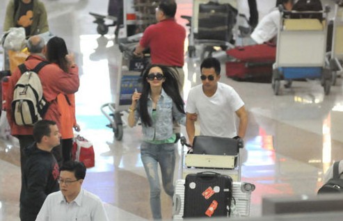 楊冪劉愷威情侶裝現(xiàn)身機(jī)場(chǎng) 楊冪摘墨鏡安檢素顏憔悴(圖)