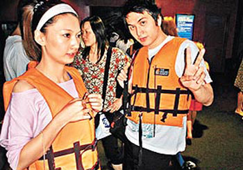 鐘麗與男友穿上救生衣,在泰國(guó)玩水上活動(dòng)
