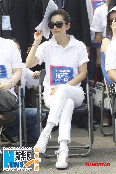 李冰冰不懼曝曬助陣接力跑 舉文件遮陽狂擦汗(組圖)