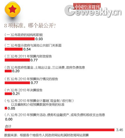 《中國經(jīng)濟(jì)周刊》獨(dú)家授權(quán)發(fā)布的清華大學(xué)《中國市級(jí)政府財(cái)政透明度研究》報(bào)告,將研究主體定位在了比省級(jí)財(cái)政更為細(xì)化的市政府:據(jù)當(dāng)前可獲得信息最近、最完整的2010年數(shù)據(jù)顯示,81個(gè)市政府,達(dá)到全國財(cái)政透明平均水平的僅43%。即使將平均水平作為及格線,多數(shù)市政府“不及格”;如果按照“60分及格”的標(biāo)準(zhǔn),則僅有7個(gè)城市過線,及格率僅為8.6%。
