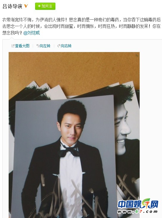 CCTV青歌賽編導(dǎo)、大型文藝晚會(huì)總導(dǎo)演呂詩在微博上肉麻示愛劉愷威,呂詩示愛“衣帶漸寬終不悔,為伊消的人憔悴!”,對(duì)劉愷威迷戀及遐想,并@給劉愷威的微博,劉愷威至今沒有回應(yīng),目前劉愷威正與楊冪熱戀,看來期望男男戀的央視導(dǎo)演呂詩只能“空悲切”了。