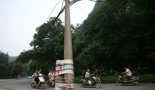 2012年6月13日,廣西桂林市穿山公園內(nèi)一根斷裂的電線桿用鐵絲和膠布簡單地固定著。
