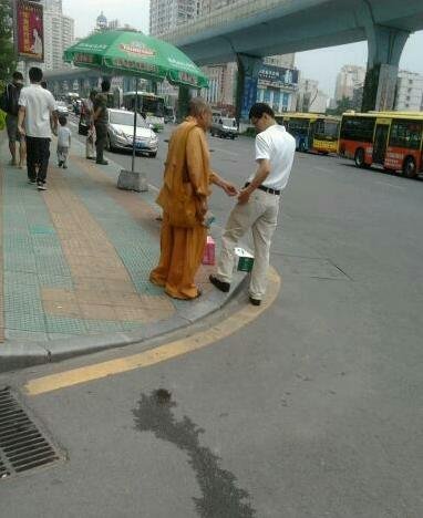 網(wǎng)友小楊告訴記者,5月下旬的一天,他跟朋友經(jīng)過(guò)火車站附近的一個(gè)公交車站時(shí),一個(gè)和尚模樣的人上來(lái)拉住他,這個(gè)“和尚”說(shuō)送他一個(gè)金黃色的牌子,就寺廟里那種有字的小牌子?!爱?dāng)時(shí)我不要,他就硬拉著我。接著拉拉扯扯了一會(huì),周圍等公交的人都回頭看了。我朋友就上來(lái)拉開(kāi)那個(gè)和尚的手,然后我們就跑了。”