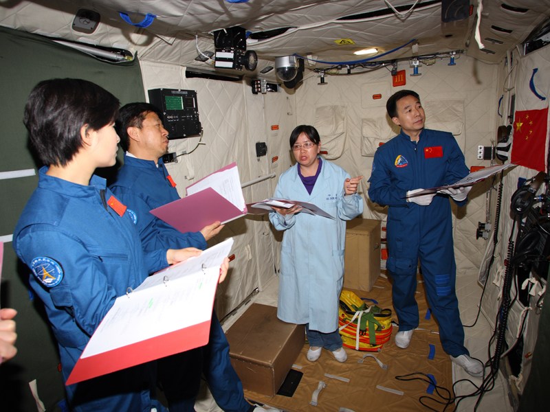 航天員教員在天宮一號組合體對執(zhí)行神舟九號飛行任務(wù)的航天員乘組景海鵬、劉旺、劉洋進(jìn)行實(shí)驗(yàn)操作訓(xùn)練。新華社發(fā)(秦憲安攝)