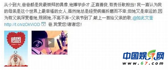 有的明星雖然不愛(ài)讓家人“拋頭露面”,但內(nèi)心對(duì)父親的感情卻非常深,例如李冰冰,她寫道:“從小到大,爸爸都是我最崇拜的偶像,他博學(xué)多才,正直善良,有責(zé)任敢擔(dān)當(dāng)!我一直認(rèn)為我的母親是這個(gè)世界上最幸福的女人,雖然她總是經(jīng)受病痛折磨而不幸,但她又是幸運(yùn)的,因?yàn)橛懈赣H深愛(ài)著她,照顧她,不離不棄~父親節(jié)到了,獻(xiàn)上一首給父親的歌,@如此文奎。爸,我愛(ài)您!謝謝您!”