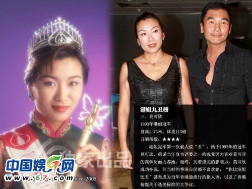 1993年的香港小姐冠軍莫可欣,也是方中信的老婆,在近日熱議的港姐九丑榜中排在第三位,丑陋指數(shù)四顆星。而港姐冠軍第一次被人說“丑”,也是從莫可欣這里開始的。