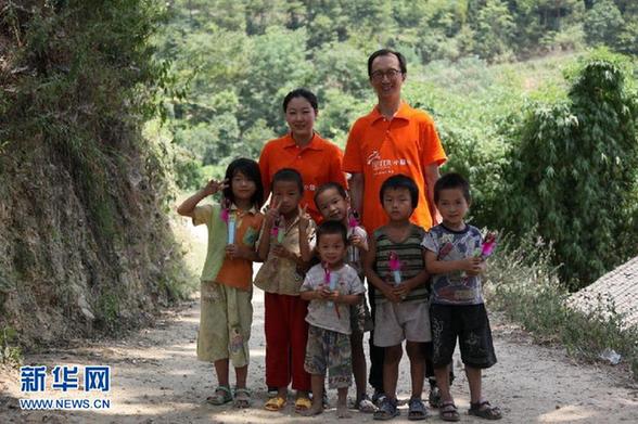 2011年8月,伏明霞(后排左)以“國(guó)際小母?!睈?ài)心大使的身份與其丈夫、慈善機(jī)構(gòu)“國(guó)際小母牛”香港分會(huì)主席梁錦松(后排右)參加小母牛貴州探訪(fǎng)團(tuán)。