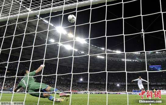 當(dāng)?shù)貢r(shí)間24日晚,2012年歐洲杯進(jìn)行了最后一場(chǎng)四分之一決賽。最終,意大利隊(duì)(藍(lán)衣)在點(diǎn)球大戰(zhàn)中4比2戰(zhàn)勝英格蘭隊(duì),鎖定最后一個(gè)四強(qiáng)席位。圖為點(diǎn)球大戰(zhàn)。