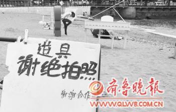 沙灘上放置了一塊寫有“道具謝絕拍照”字樣的紙牌。