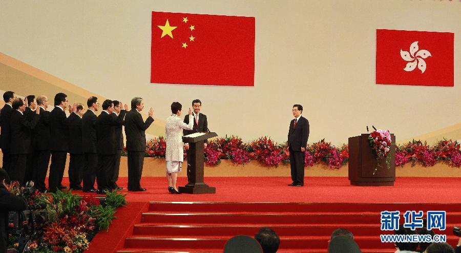 7月1日,中共中央總書記、國(guó)家主席、中央軍委主席胡錦濤出席慶祝香港回歸祖國(guó)15周年大會(huì)暨香港特別行政區(qū)第四屆政府就職典禮。這是香港特別行政區(qū)第四屆政府的主要官員在梁振英帶領(lǐng)下宣誓就職,胡錦濤主席監(jiān)誓。新華社記者鞠鵬攝