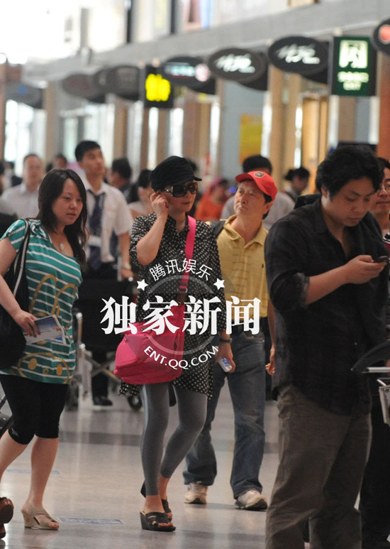 51歲蔡明波點連衣裙扮潮 黑超遮面低調離京(組圖)