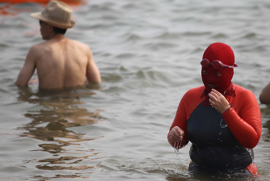 7月6日,山東青島第一海水浴場(chǎng),女士們戴著尼龍面罩在海水浴場(chǎng)游泳。
