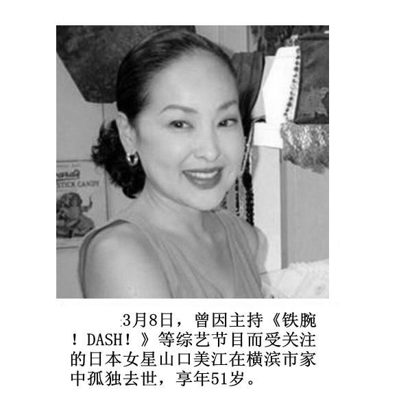 據(jù)日本媒體報道,女星山口美江3月8日在橫濱市家中孤獨死去,享年51歲。她因拍攝廣告、主持《鐵腕!DASH!》等綜藝節(jié)目而受關(guān)注,還與很多名人傳出過戀情,不過1996年她因自殺未遂精神不安定,因此退出了演藝圈,之后又照顧生病的父親,一生經(jīng)歷很多辛苦。