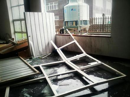 網(wǎng)友@平老虎12日下午16:10左右發(fā)微博:“城陽河套狂風暴雨,我們廠房窗戶被西風刮碎。請青島朋友注意西窗。”(感謝網(wǎng)友@平老虎提供圖片)