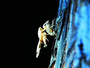 “看到?jīng)],這幾個(gè)知了猴要脫殼了,成語‘金蟬脫殼’說的就是這個(gè)。 ”晚上9時(shí)許,記者在一片樹林中,遇到了張先生和他的兒子,“這個(gè)時(shí)間,知了猴都開始脫殼了,我們小時(shí)候都見過,但現(xiàn)在城市孩子見過的不多,正好讓孩子見識(shí)見識(shí)。 ”張先生笑著說。果然,記者看到在張先生身旁的幾棵樹上,幾個(gè)知了猴都已經(jīng)開始脫殼,有的已經(jīng)完全“變身”,還有的剛剛開始脫。
