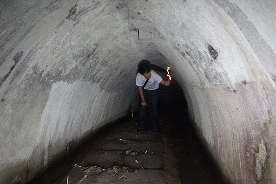 記者點著蠟燭前行,蠟燭用以觀察下水道內(nèi)氧氣是否充足。